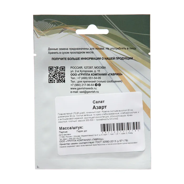 Семена Салат "Азарт", ц/п, 10 г — Характеристики