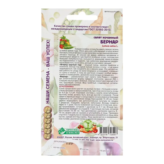 Семена Салат "Бернар", 0,5 гр — Характеристики