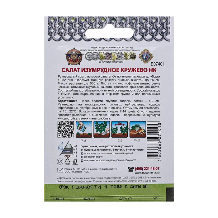 Семена Салат листовой "Изумрудное кружево НК", серия Кольчуга, ц/п, 1 г — Характеристики