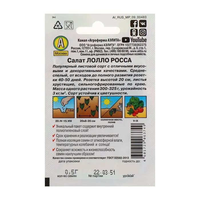 «Лолло Росса» — это раннеспелый сорт салата, у которого период от массовых всходов до хозяйственной годности длится 35–40 дней. Он отличается устойчивостью к цветушности и длительным периодом использования.