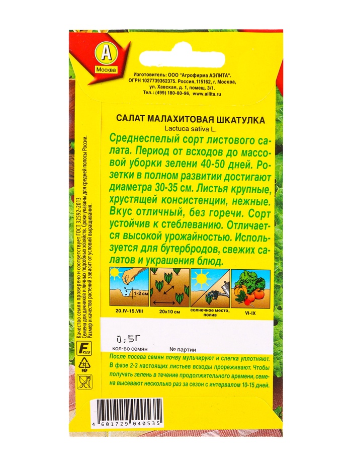 Семена Салат «Малахитовая шкатулка», листовой, 0.5 г, «Агрофирма АЭЛИТА» — Характеристики