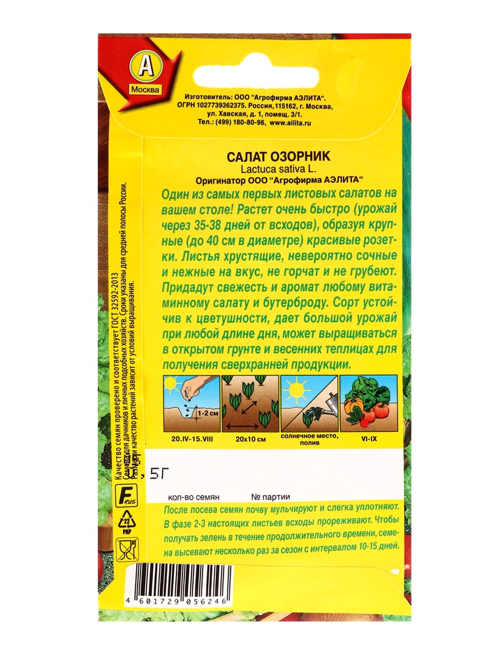 Семена Салат «Озорник», листовой, 0.5 г, «Агрофирма АЭЛИТА» — Характеристики