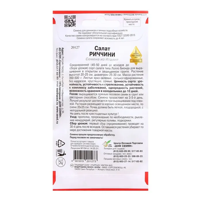 Среднеранний (45-50 дней от всходов до сбора урожая) сорт салата типа Лолло Бионда для выращивания в открытом и защищенном грунте. Растение высотой 20-25 см, диаметром 25-30 см. Масса растения 350-700 г. Листья ярко-зеленые, сильногофрированные, без надрезов, хрустящие, сочные. Ценность сорта: урожайность, устойчивость к стрелкованию, устойчивость к комплексу заболеваний, однородность растений, возможность хранения в холодильнике до 10 дней.Посев: выращивается прямым посевом семян в грунт или рассадным способом. Семена прорастают на 3-5-й день. Лучший результат достигается при выращивании под пленкой. Растения размещают в хорошо освещенном месте, по схеме 20х35 см. Почва должна быть легкой, плодородной, с нейтральной реакцией. Не сеять после крестоцветных культур !Уход: прополка, прореживание по необходимости, рыхление междурядий, регулярные поливы, подкормки.Сбор урожая: первый сбор (прореживание) проводят на 30-й день после всходов. Оставшиеся растения убирают по мере достижения товарной массы.Семена прошли предпосевную обработку. Перед посевом не замачивать!
