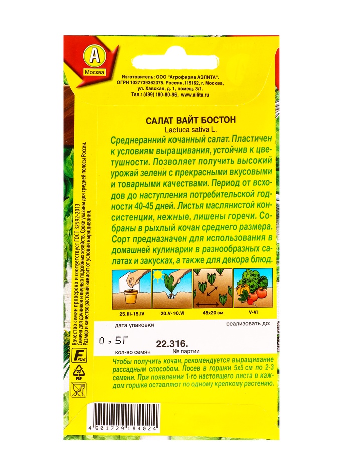 Семена Салат «Вайт бостон», 0.5 г, «Агрофирма АЭЛИТА» — Характеристики