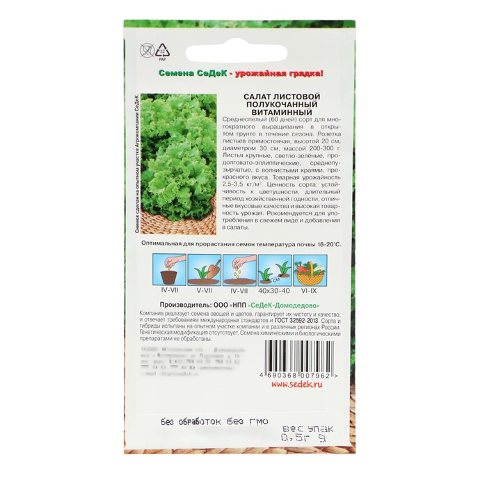 Среднеспелый сорт (период от массовых всходов до начала технической спелости 50-60 дней) листового салата. Растение среднерослое, розетка листьев полуприподнятая. Лист темно-зеленый, средней толщины, глянцевый, среднепузырчатый, мякоть маслянистая. Масса одного растения 60-70 г.