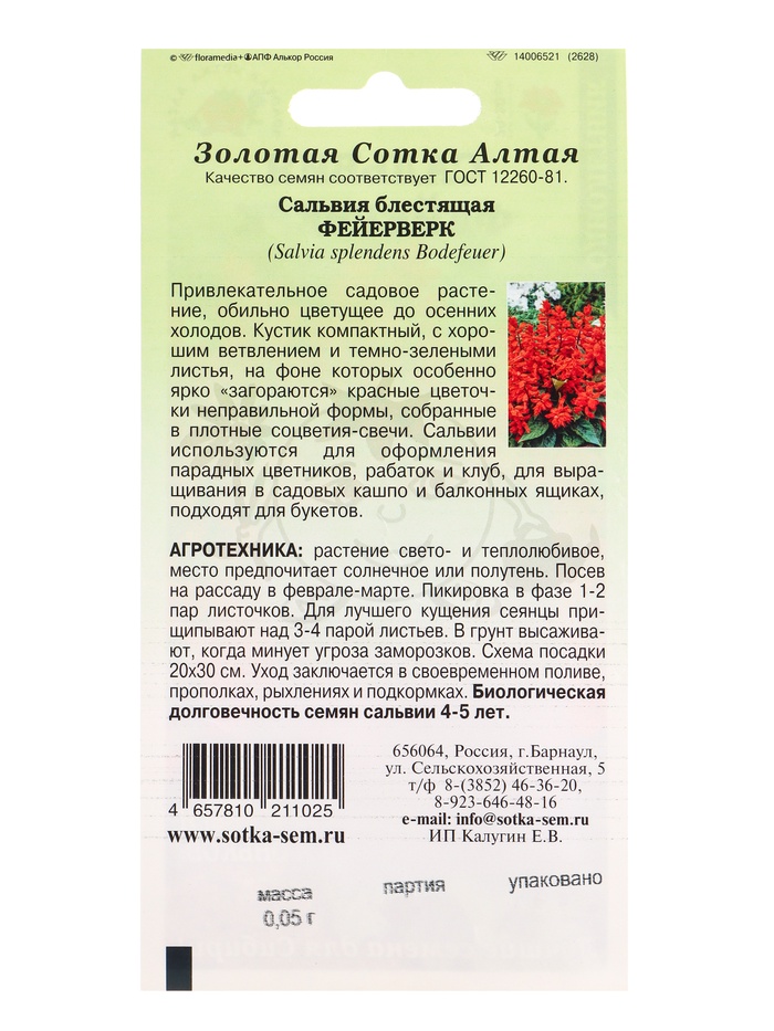 Семена Сальвия «Фейерверк», 0.05 г, «Золотая Сотка Алтая» — Характеристики