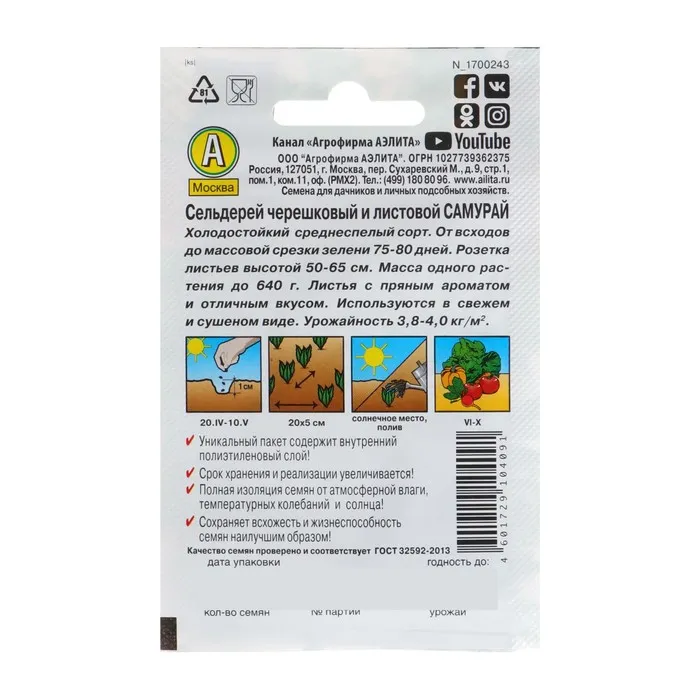 «Самурай» — это холодостойкий среднеспелый сорт, у которого период от всходов до начала хозяйственной годности составляет 72–82 дня. Он содержит большое количество витаминов, минералов, аминокислот и эфирных масел.