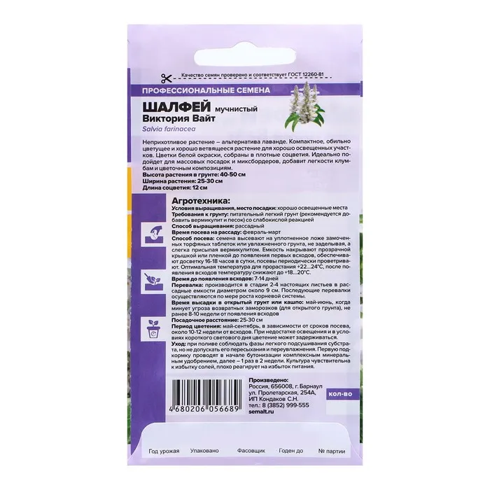 Виктория Вайт - эффектный сорт шалфея с восхитительными серебристо-белыми соцветиями. Элегантные и стройные шпили соцветий, идеально ровные по высоте, гармонично вписываются в любой ландшафтный дизайн и кардинально преображают его. Шалфей Виктория Вайт красиво смотрится соло и в сочетании с другими растениями, придавая клумбе особую нежность и изысканность. Декоративные особенности Мучнистый шалфей Виктория Вайт - это травянистое многолетнее растение, формирующее компактные, хорошо ветвящиеся кусты высотой до 40-50 см. Густооблиственные побеги образуют пышную крону диаметром до 30 см. Украшением сорта являются белые цветки, собранные в плотные соцветия размером до 12 см. Цветение многолетника очень длительное и обильное, с мая-июня до сентября. В ландшафтном дизайне Шалфей Виктория Вайт - один из фаворитов ландшафтных дизайнеров позволяющий экспериментировать с классическими и креативными композициями. Многолетнее растение со множеством воздушных серебристо-белых соцветий идеально подходит для массовой посадки на клумбе, добавит изысканность и легкость миксбордерам и сборным цветочным композициям. Викторию Вайт можно использовать для оформления классической, вертикальной или многоярусной клумбы, которая раскроет всю красоту изящного цветка. Благодаря компактности шалфей может выращиваться в ящиках и вазонах, украшая балконы и террасы. Условия для выращивания Шалфей сорта Виктория Вайт лучше всего растет на хорошо освещенных участках с легким, рыхлым грунтом, с добавлением крупнозернистого песка и органики. Растение выращивается из рассады. Посев на рассаду производят в феврале или марте. Рассадные стаканчики или контейнеры оставляют под стеклянной крышкой или пленкой до прорастания, после образования 3-4 настоящих листочков переваливают в индивидуальные емкости. Оптимальное время для пересадки на постоянное место - май и июнь. Уход за шалфеем заключается в своевременных поливах, внесении комплексных минеральных удобрений каждые 2 недели и аккуратных рыхлениях почвы вокруг кустов.
