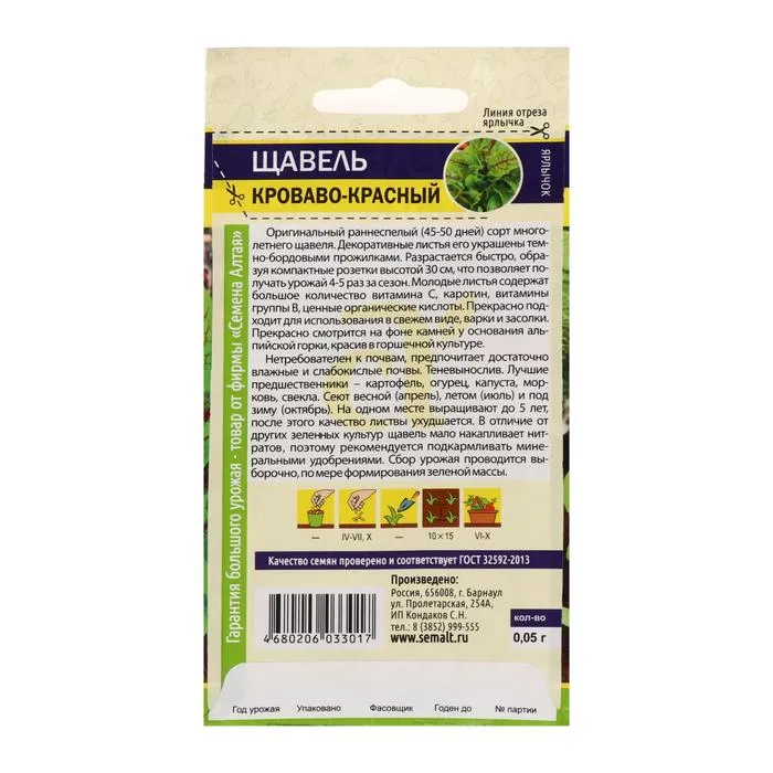Оригинальный раннеспелый (45-50 дней) сорт многолетнего щавеля. Декоративные листья его украшены темно-бордовыми прожилками. Разрастается быстро, образуя компактные розетки высотой 30 см, что позволяет получать урожай 4-5 раз за сезон. Молодые листья содержат большое количество витамина С, каротин, витамины группы В, ценные органические кислоты. Прекрасно подходит для использования в свежем виде, варки и засолки. Прекрасно смотрится на фоне камней у основания альпийской горки, красив в горшечной культуре.
