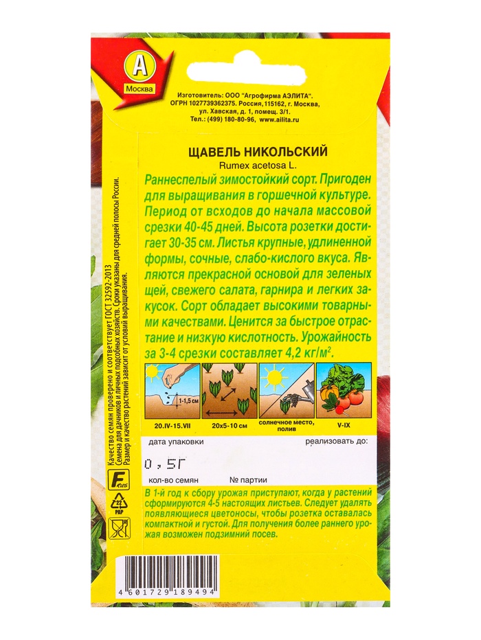 Семена Щавель Никольский, Ц/П,0,5 г — Характеристики