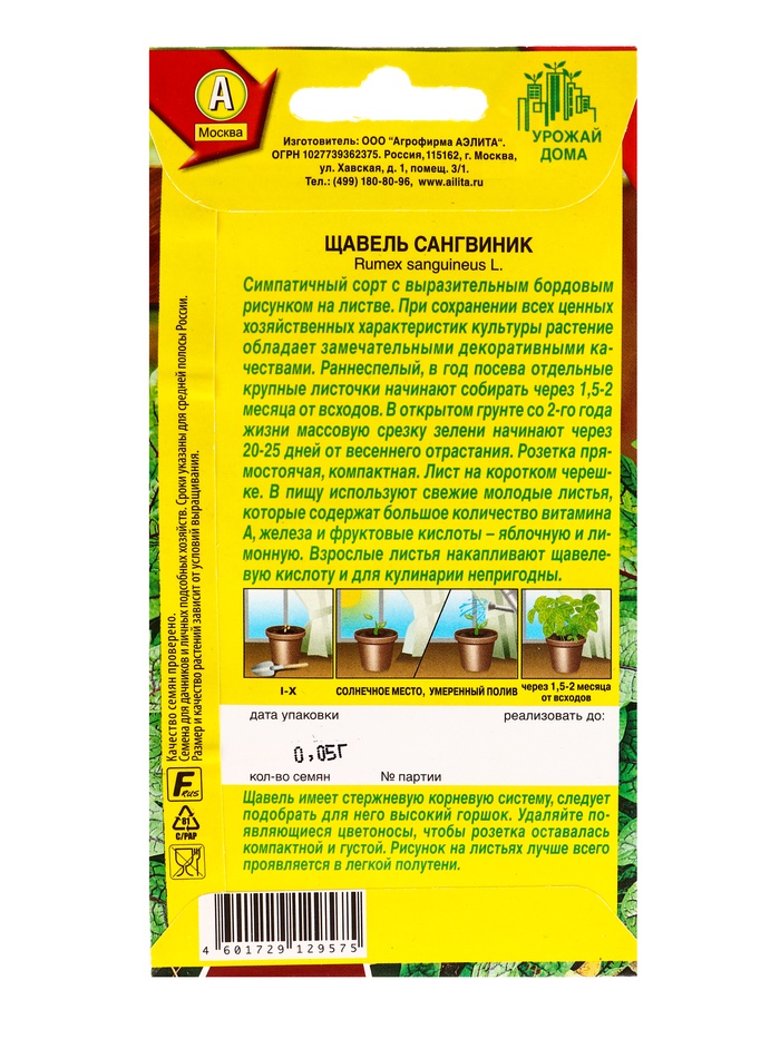 Семена Щавель Сангвиник Урожай дома, Ц/П,0,05 г — Характеристики