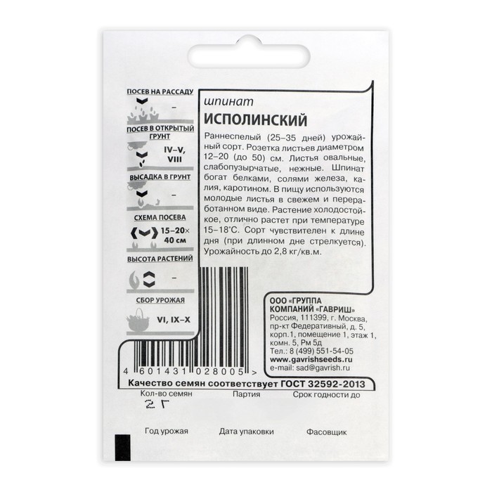 Раннеспелый (25-35 дней от полных всходов до уборки урожая) очень урожайный сорт. Розетка листьев диаметром 12-20 (до 50) см. Листья овальные, слабопузырчатые, сочные, нежные. Шпинат богат белками, солями железа, калия, каротином. В пищу используются молодые листья в свежем и переработанном виде. Сохраняет свои вкусовые качества при консервировании. Растение холодостойкое, отлично растет при температуре 15-18ºС. Сорт чувствителен к длине дня (при длинном дне стрелкуется). Урожайность до 2,8 кг/м2.