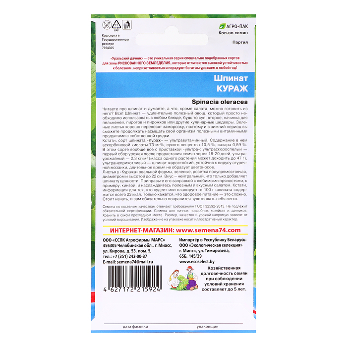 Семена Шпинат «Кураж», 2 г, «Уральский Дачник» — Характеристики