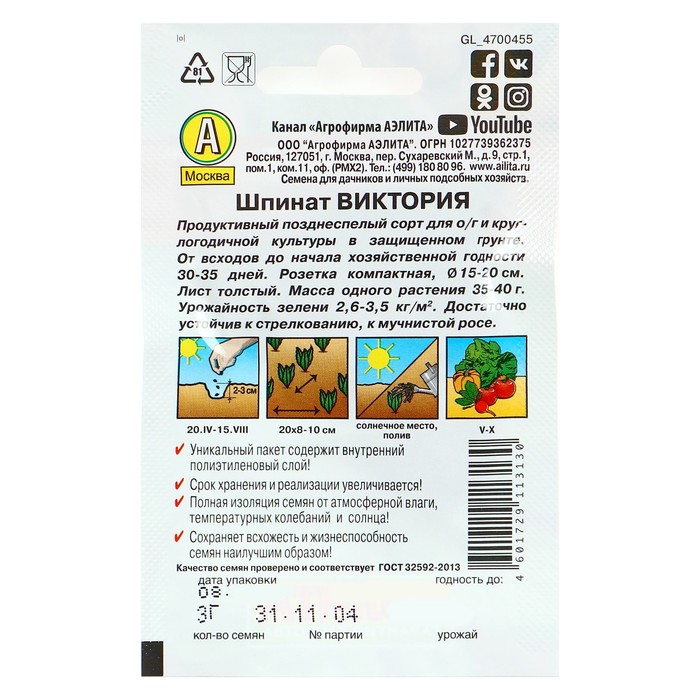 Семена Шпинат "Виктория" "Лидер", 3 г , — Характеристики
