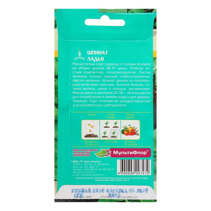 Семена Шпината «Ладья» раннеспелый, розетка листьев крупная, диетичный, 1 г — Характеристики
