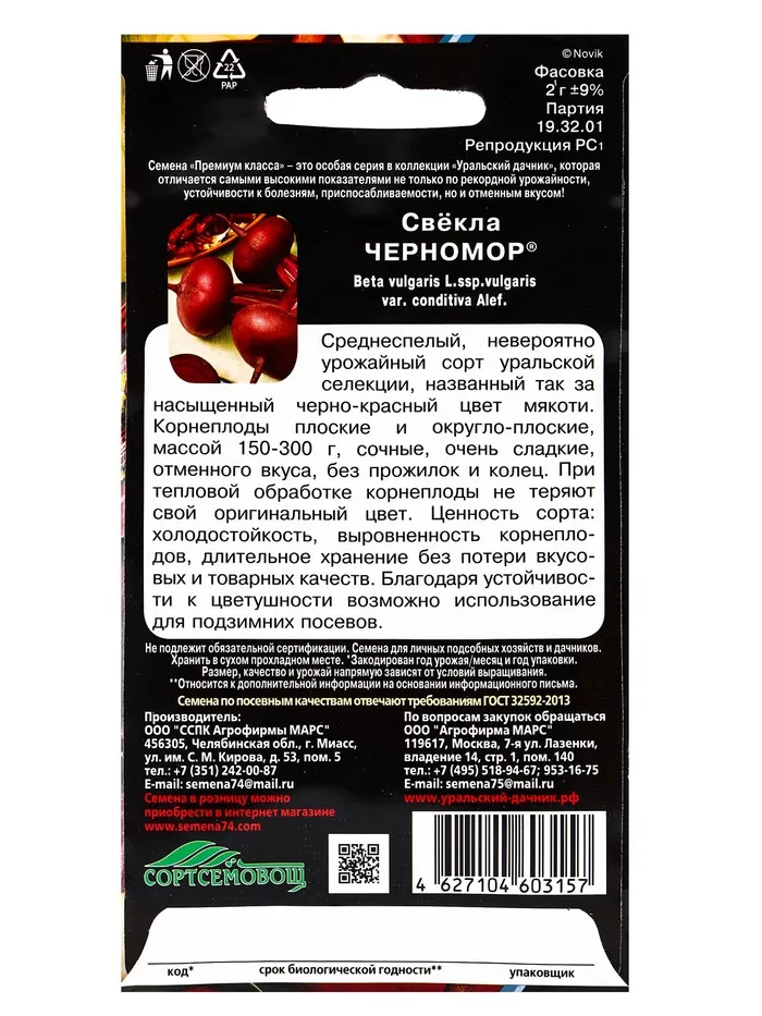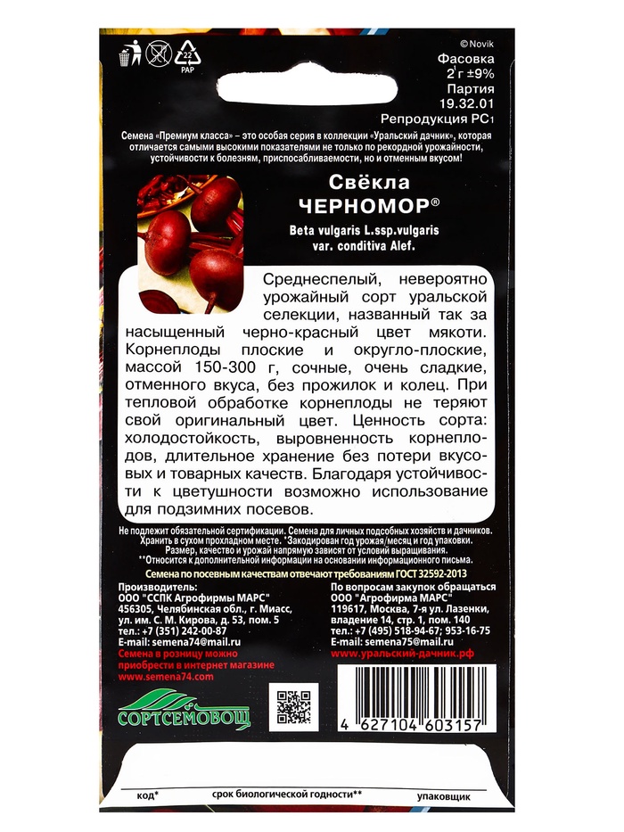 Среднеспелый, невероятно урожайный сорт уральской селекции, названый так за насыщенный, чёрно-красный цвет мякоти. Корнеплоды плоские и округло-плоские, массой 150-300 г, сочные, очень сладкие, отменного вкуса, без прожилок и колец. При тепловой обработке корнеплоды не теряют свой оригинальный цвет.