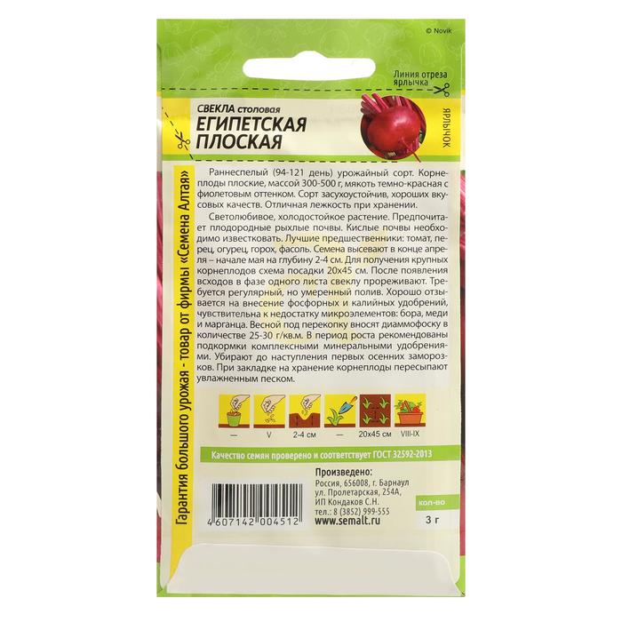 Раннеспелый (94-121 день), урожайный сорт. Корнеплоды плоские, массой 300-500 г, мякоть темно-красная с фиолетовым оттенком. Сорт засухоустойчив, хорошие вкусовые качества Отличная лежкость при хранении. Светолюбивое, холодостойкое растение. Предпочитает плодородные рыхлые почвы. Кислые почвы необходимо известковать. Лучшие предшественники: томат, перец, огурец, горох, фасоль. Семена высевают в конце апреля — начале мая на глубину 2-4 см. Для получения крупных корнеплодов схема посадки 20х45 см. После появления всходов в фазе одного листа свеклу прореживают. Требуется регулярный, но умеренный полив. Хорошо отзывается на внесение фосфорных и калийных удобрений, чувствительна к недостатку микроэлементов: бора, меди и марганца. Весной под перекопку вносят диаммофоску в количестве 25-30 г/кв.м. В период роста рекомендованы подкормки комплексными минеральными удобрениями. Убирают до наступления первых осенних заморозков. При закладке на хранение корнеплоды пересыпают увлажненным песком.