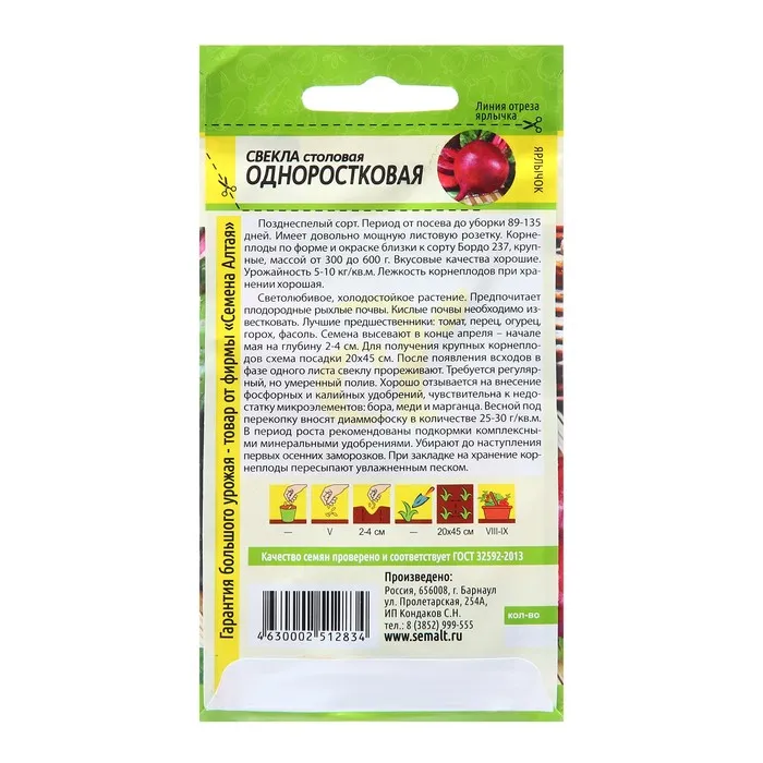 Позднеспелый сорт. Период от посева до уборки 89-135 дней. Имеет довольно мощную листовую розетку. Корнеплоды по форме и окраске близки к сорту Бордо 237, крупные, массой от 300 до 600 г. Вкусовые качества хорошие. Урожайность 5-10 кг/кв.м. Лежкость корнеплодов при хранении хорошая. Светолюбивое, холодостойкое растение. Предпочитает плодородные рыхлые почвы. Кислые почвы необходимо известковать. Лучшие предшественники: томат, перец, огурец, горох, фасоль. Семена высевают в конце апреля — начале мая на глубину 2-4 см. Для получения крупных корнеплодов схема посадки 20х45 см. После появления всходов в фазе одного листа свеклу прореживают. Требуется регулярный, но умеренный полив. Хорошо отзывается на внесение фосфорных и калийных удобрений, чувствительна к недостатку микроэлементов: бора, меди и марганца. Весной под перекопку вносят диаммофоску в количестве 25-30 г/кв.м. В период роста рекомендованы подкормки комплексными минеральными удобрениями. Убирают до наступления первых осенних заморозков. При закладке на хранение корнеплоды пересыпают увлажненным песком.