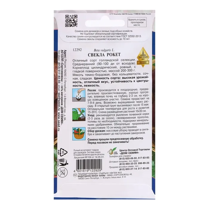 Отличный сорт голландской селекции. Среднеспелый (110-120 дн. от всх.) сорт голландской селекции. Корнеплод цилиндрический, ровный, с гладкой поверхностью, массой 200-300 г. Мякоть темно-бордовая, без кольцеватости, сочная, сладкая. Ценность сорта: высокая урожайность, отличный вкус, устойчивость к цветушности. Для свежего потребления, переработки и длительного хранения.Посев: производится в плодородную, предварительно произвесткованную, хорошо прогретую почву на глубину 2-3 см , на хорошо освещенном участке. Возможно выращивание через рассаду. В открытый грунт высаживают после 15 мая. Растения размещают по схеме 10х30 см. Перед посевом не замачивать!Уход: рекомендуется рыхление почвенной корки (2-3 раза за сезон) , своевременная прополка, поливы по необходимости, подкормки минеральными удобрениями. Обязательно прореживание на расстояние 10 см между растениями. Сбор урожая: масовую уборку проводят в сентябре и заканчивают до наступления заморозков.