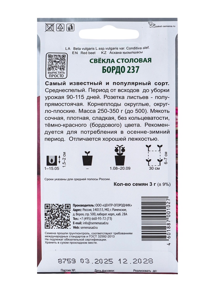 Среднеспелый. Период от всходов до уборки урожая 90-115 дней. Розетка листьев - полустоячая. Корнеплоды округлые, округло-плоские. Масса 250-350 (до 500) г. Мякоть сочная, плотная, сладкая, без кольцеватости, тёмно-красного (бордового) цвета. Рекомендуется для потребления в осенне-зимний период. Отличается хорошей лежкостью.