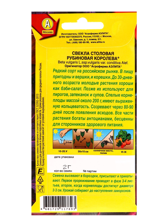 Семена Свекла столовая «Рубиновая королева», «Агрофирма АЭЛИТА», 2 г — Характеристики