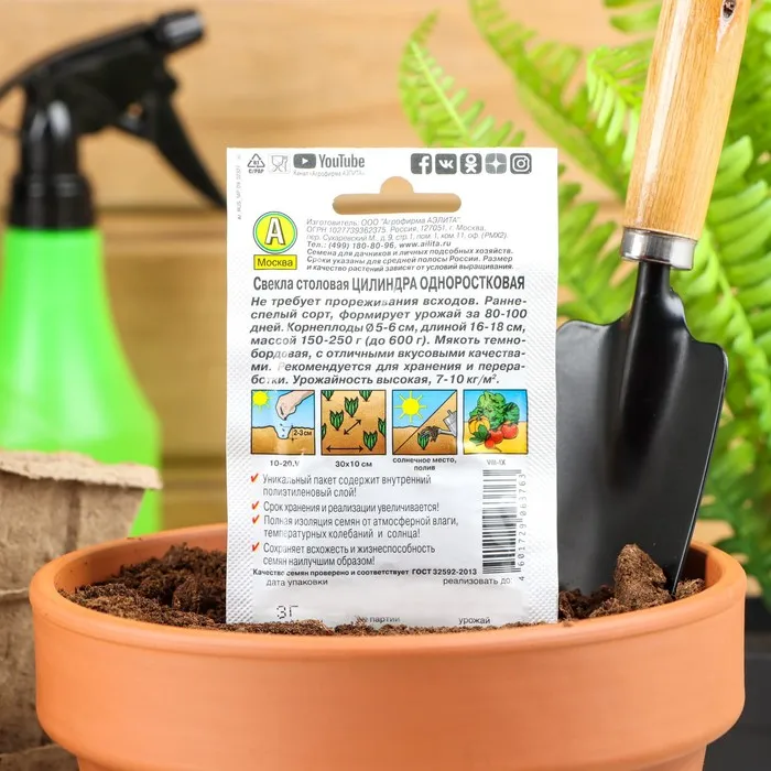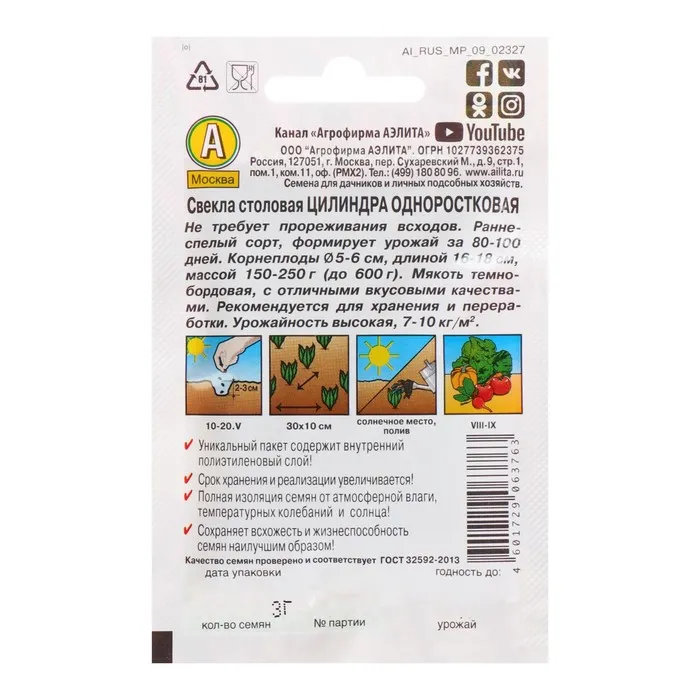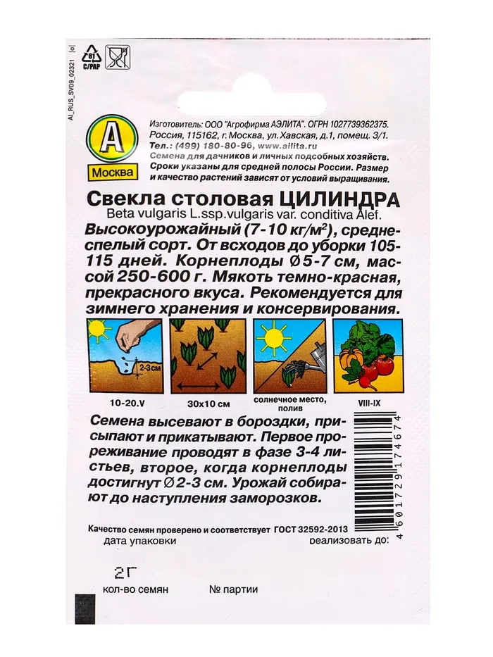 Не требует прореживания всходов. Раннеспелый сорт, формирует урожай за 100-110 дней. Корнеплоды Ø 5-6 см, длиной 16-18 см, массой 250-350 г (до 600 г). Мякоть темно-бордовая, с отличными вкусовыми качествами. Рекомендуется для хранения и переработки. Урожайность высокая, 7-10 кг/м2.