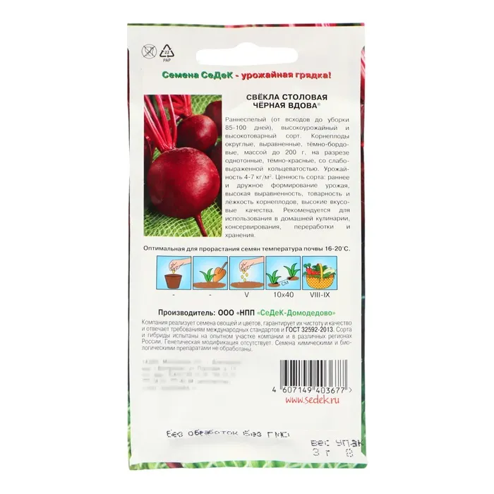 Раннеспелый (от всходов до уборки 85-100 дней) высокоурожайный и высокотоварный сорт. Корнеплоды округлые, выравненные, тёмно-бордовые, массой до 200 г, на разрезе однотонные, тёмно-красные, со слабовыраженной кольцеватостью. Урожайность 4,0-7,0 кг/м2.