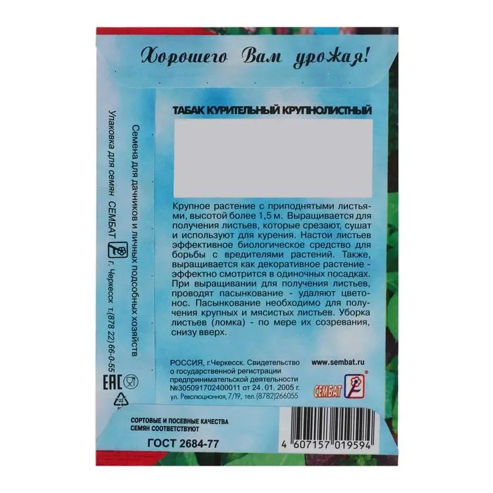 Однолетнее травянистое растение, может достигать высоты более 100 см. Лист темно-зеленый с сизоватым оттенком, опушенный. Пластинка листа эллиптическая, поверхность гладкая. Растение устойчиво к черной корневой гнили, вирусу табачной мозаики, бактериальной рябухе, белой пестрице. Содержание никотина в листьях около 2%. Рекомендуется для сигарет и курительных трубок.