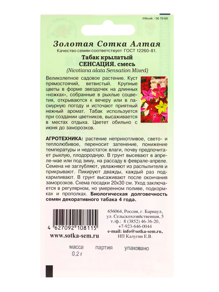 Семена Табак «Сенсация крылатый», 0.2 г, «Золотая Сотка Алтая» — Характеристики