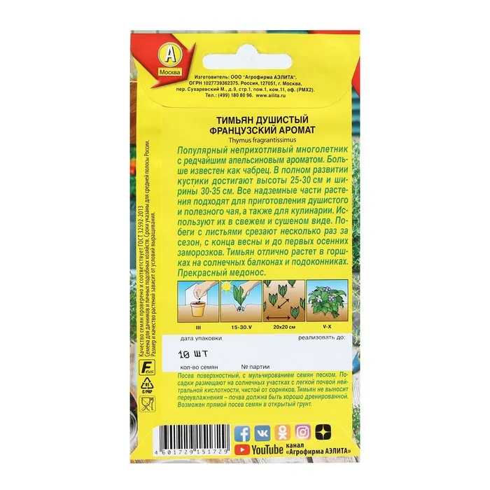 Посев поверхностный, с мульчированием семян песком. По садки размещают на солнечных участках с легкой почвой ней тральной кислотности, чистой от сорняков. Тимьян не выносит переувлажнения – почва должна быть хорошо дренированной. Возможен прямой посев семян в открытый грунт.