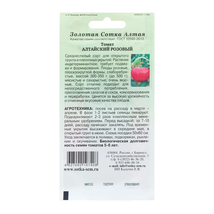 Семена Томат "Алтайский розовый" среднеспелый, 0,1 г — Характеристики