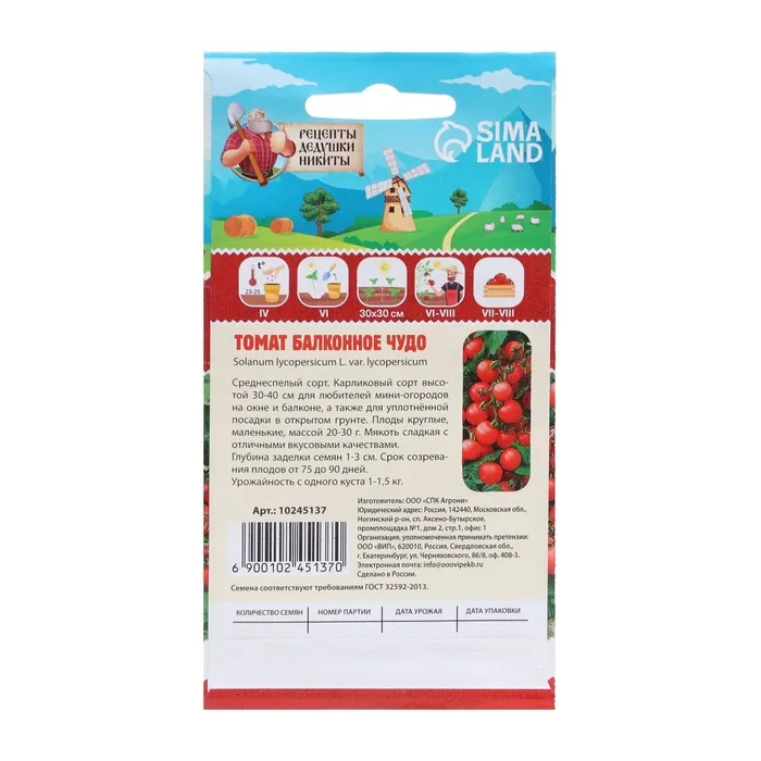 Семена Томат "Балконное чудо", ультраскороспелый, детерминантный,низкорослый, 0,1 г — Характеристики