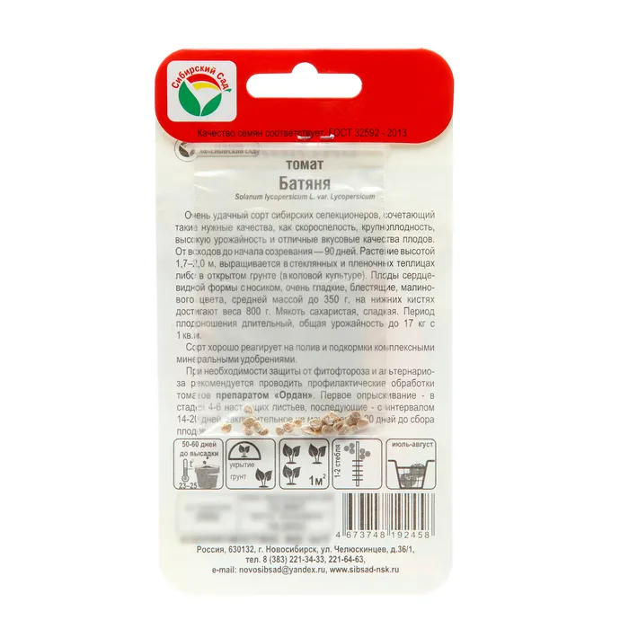 Очень удачный сорт сибирских селекционеров, сочетающий такие нужные качества, как скороспелость, крупноплодность, высокую урожайность и отличные вкусовые качества плодов. От всходов до начала созревания — 90 дней. Растение высотой 1,7-2,0 м, выращивается в стеклянных и пленочных теплицах либо в открытом грунте (в коловой культуре). Плоды сердцевидной формы с носиком, очень гладкие, блестящие, малинового цвета, массой 200-350 г, сахаристые, сладкие. Период плодоношения длительный, общая урожайность до 17 кг с 1 кв.м.