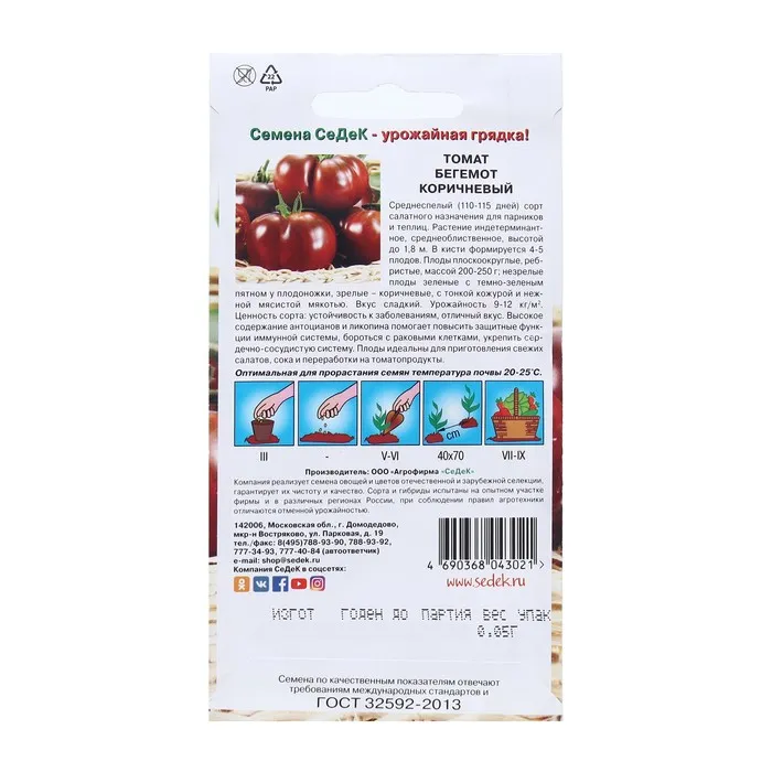 Среднеспелый (110-115 дней) сорт салатного назначения для парников и теплиц. Растение индетерминантное, среднеоблиственное, высотой до 1,8 м. В кисти формируется 4-5 плодов. Плоды плоскоокруглые ребристые, массой 200-250 г, незрелые плоды зеленые с темно-зеленым пятном у плодоножки, зрелые коричневые с тонкой кожурой и нежной, мясистой мякотью. Вкус сладкий. Урожайность 9-12 кг/м.кв. Ценность сорта: устойчивость к заболеваниям, отличный вкус. Высокое содержание антоцианов и ликопина помогает повысить защитные функции иммунной системы, бороться с раковыми клетками, укрепить сердечно-сосудистую систему. Плоды идеальны для приготовления сек салатов, сока и переработки на томатопродукты.