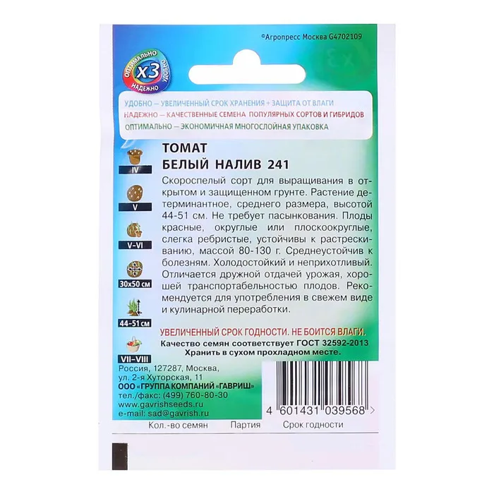 Семена Томат "Белый налив 241", раннеспелый, детерминантный 0,05 г серия ХИТх3 — Характеристики