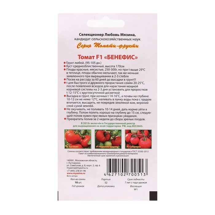 Семена томата (помидора) «Бенефис F1» хорошо прорастают как в теплице, так и в открытом грунте. Кусты среднерослые, густооблиственные. Кисть сложная, формирует по 3-4 крупных плода. Богатый урожай можно собирать через 95-105 дней после появления первых всходов. Плоды отличаются средней массой до 250-300 граммов, округлой формой, ярко-красной глянцевой кожицей с небольшой ребристостью. Используют «Бенефис F1» для потребления в свежем виде, различных переработок. В цельноплодном консервировании данный сорт применяют редко.
