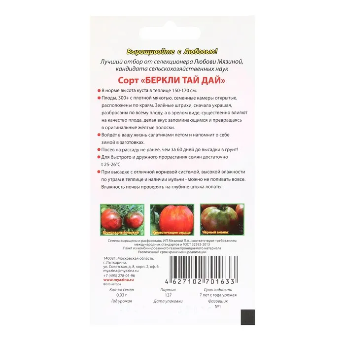 Достойный и популярный у садоводов томат из семейства Berkeley Tie-Dye. Создан известным американским селекционером Брэдом Гейтсом. Томат раннего срока созревания – от всходов до первого сбора плодов 105-110 суток. Сорт рекомендуется выращивать в теплицах и открытом грунте. Растение индетерминантное, в теплице высотой 1,8-2,0 м. Плоды* с очень яркой и неповторимой окраской, массой 250-300 г, плотные и мясистые, не растрескиваются. Насыщенный томатный вкус с фруктовым оттенком заслужил только восторженные отзывы. Сорт прекрасно подходит для приготовления салатов, консервирования, вяления и переработки на томатопродукты. Урожайность в теплице – 10-12 кг/м2.