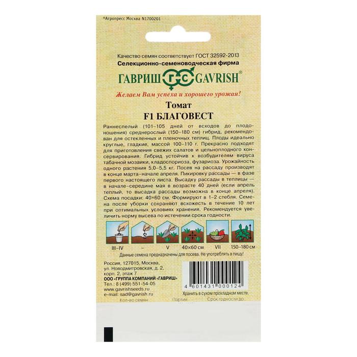 «Благовест» — это популярный среднеспелый сорт помидоров для открытого грунта и плёночных укрытий. Техническая спелость наступает на 100–105-й день от всходов. Высота растения составляет 150–180 см.