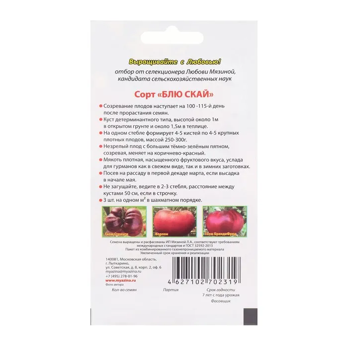 Среднеспелый, созревание плодов наступает на 115-120-й день после прорастания семян. Урожайный сорт, дающий с квадратного метра по двадцать килограммов среднеплодных томатов. В кисти созревает 6-8 плодов, на растении одновременно может сформироваться до восьми кистей. Куст детерминантного типа. Вырастает высотой 70-80 сантиметров в открытом грунте и до полутора метров в тепличных условиях. Растение требует подвязки и выборочного пасынкования. Формировка куста ведется в два — три ствола для теплиц и в два – для открытого грунта. Плоды сорта Блю скай (Голубые небеса) необычайные.Это экзотический и эксклюзивный сорт, выращивать который мечтают многие дачники. Томаты имеют форму плоско-округлого типа, крупные, плотные, весить могут от 300 до 500-600 граммов. В стадии зрелости начинают причудливо окрашиваться в радужный спектр, который включает фиолетовый, лиловый, синий и темно-синий, красный и розовый оттенки. Вся это «радуга на грядке» имеет очень хороший вкус. Мякоть темно-вишневая, сахаристая, тает во рту. Плоды сочные, фруктово-цветочного аромата. Сорт пригоден для свежего потребления и консервации. Устойчив к болезням. Рассаду сеют за 60-65 суток до высадки саженцев в грунт. Размещение на квадратном метре – четыре — пять растений.