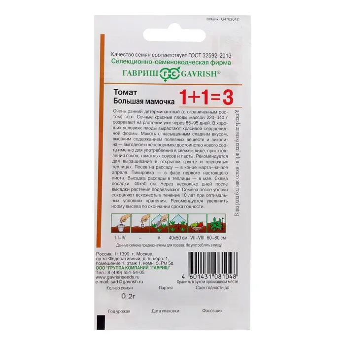 Очень ранний детерминантный (с ограниченным ростом) низкорослый сорт. Сочные красные сердцевидные плоды, массой 220-340 г созревают на растении уже через 85-95 дней. Мякоть с насыщенным сладким вкусом, высоким содержанием полезных веществ и ликопина — выгодное и неоспоримое достоинство нового сорта именно для употребления в свежем виде, приготовления соков, томатных соусов и пасты. Рекомендуется для выращивания в открытом грунте и пленочных теплицах. Посев на рассаду — в конце марта — начале апреля. Пикировка — в фазе первого настоящего листа. Высадка рассады в теплицы — в мае. Схема посадки: 40х50 см. Через несколько дней после высадки растения подвязывают. Урожайность до 4,5 кг/растение.