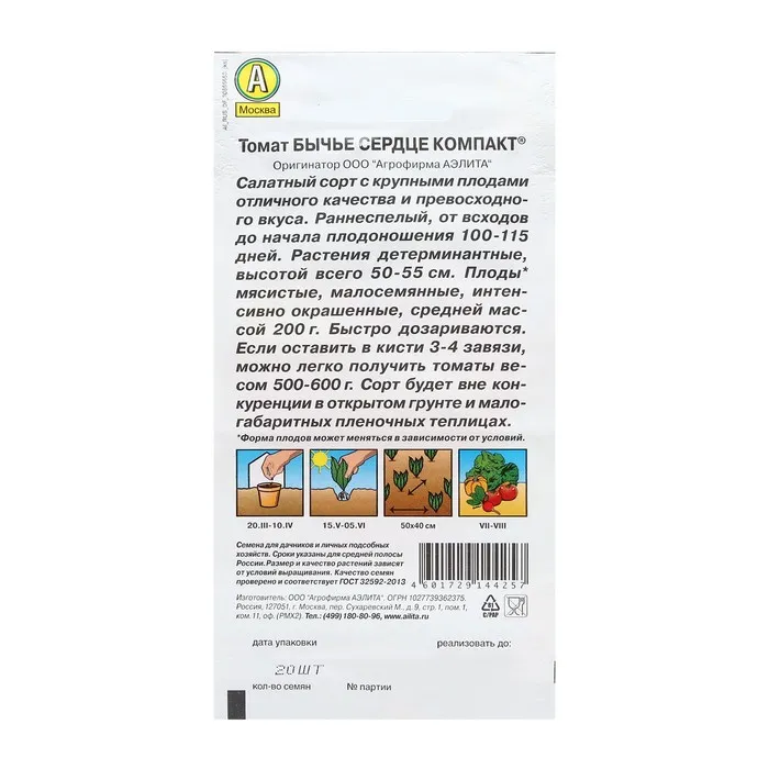 Семена Томат "Бычье сердце", компакт, детерминантный, низкорослый 20 шт — Характеристики