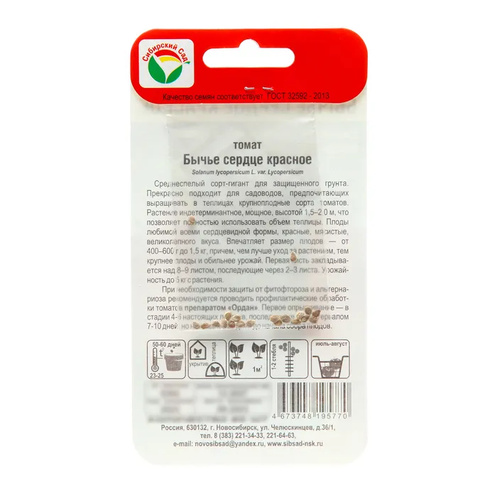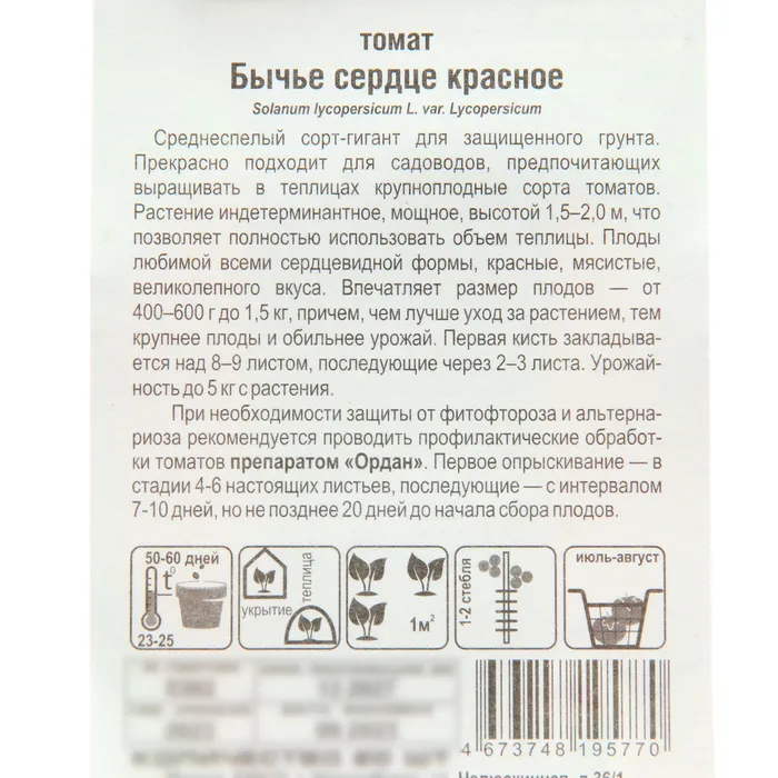 Томат Бычье Сердце - среднеспелый, детерминантный сорт с крупными, мясистыми плодами прекрасного вкуса. От всходов до созревания плодов 105-110 дней. Растение среднерослое. Первое соцветие закладывается над 8-9 листом, последующие - через 1-2 листа. Помидоры сердцевидной формы, красной окраски, без зелёного пятна у плодоножки, гладкие, плотные, многогнёздные, мясистые, массой 180-200 г. Высокая дружность плодоношения. Вкусовые качества плодов отличные. Устойчив к основным болезням. Предназначен для потребления в свежем виде. Томат Бычье Сердце рекомендуется для выращивания открытом грунте на шпалере или в коловой культуре, в плёночных теплицах с формированием в 2 стебля. Схема посадки 70х30 см. Урожайность в открытом грунте 7-9 кг/м2, в пленочных теплицах 10,5-12 кг/м2.
