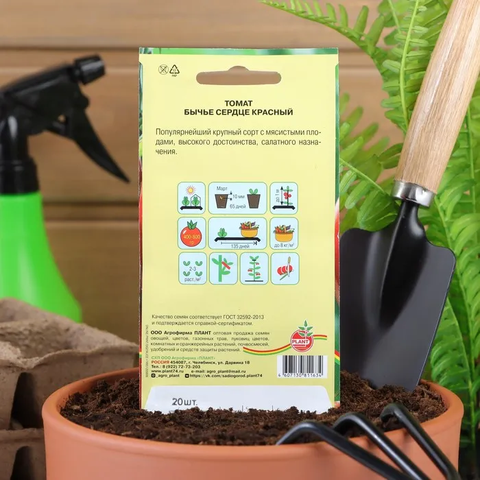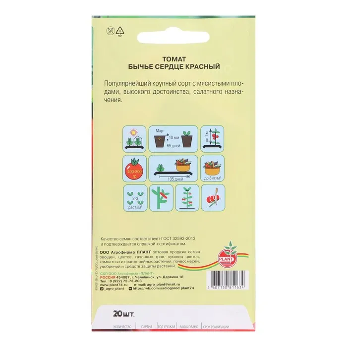 Среднеспелый (100-117 дней) сорт салатного назначения для открытого грунта (с подвязкой к кольям), пленочных парников и теплиц. Растение индетерминантное, высотой до 1,5 м. Требует пасынкования, формируется в один стебель. На кисти – 3-4 плода. Плоды конусовидные (напоминают форму сердца), красные, гладкие, массой 400-600 г и более, мясистые, с повышенным содержанием сахара. Ценность сорта: крупноплодность, отличные вкусовые качества. Рекомендуется для употребления в свежем виде.