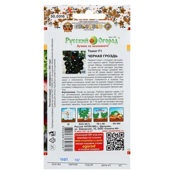 Раннеспелый индетерминантный гибрид, созревающий через 75 дней после всходов. Первый томат с плодами насыщенного черного цвета! Коктейльные плоды массой по 35-70 грамм каждый имеют приятный аромат и сливовое послевкусие. Их темная кожура богата мощными антиоксидантами - антоцианами и ликопином. Пигмент появляется в кожице под действием солнечных лучей уже на ранней стации созревания. При недостаточном солнечном освещении (в тепличных условиях) поверхность плодов менее насыщена черным цветом.