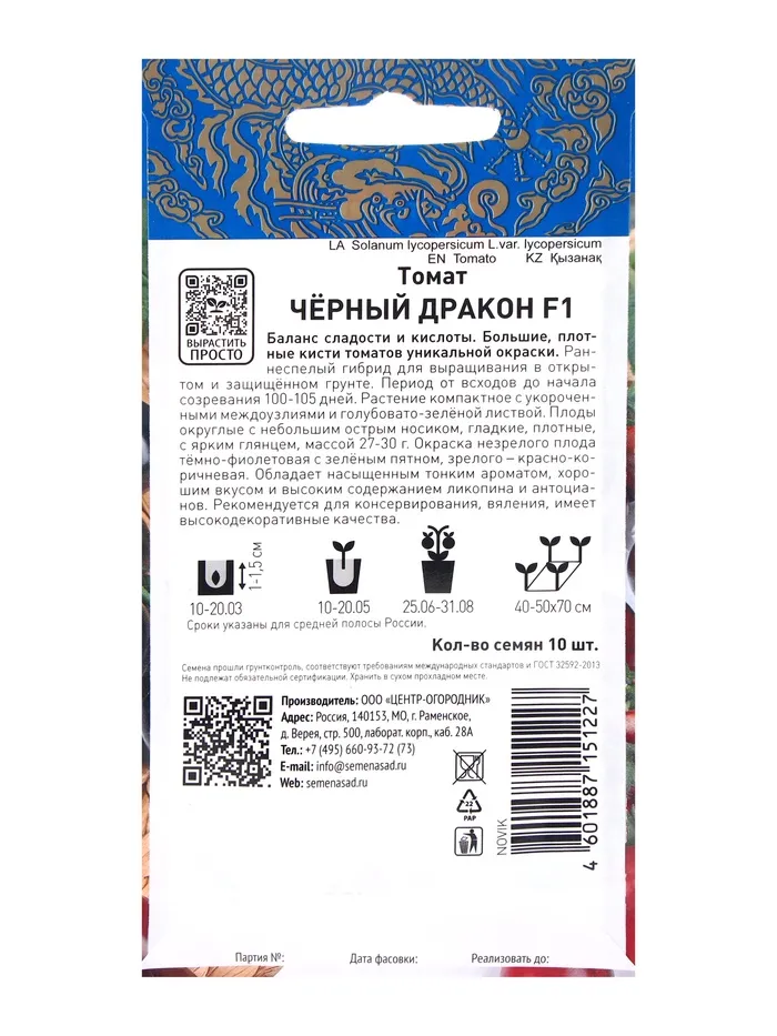Семена томатов «Чёрный дракон» представляют собой отличный выбор для садоводов, стремящихся к оригинальности и изысканности в своем огороде. Этот гибрид ценят за его насыщенный вкус и уникальный цвет плодов, что делает его фаворитом как среди профессиональных агрономов, так и любителей. Со сроком годности в 4 года, вы можете быть уверены в сохранении их качества и всхожести в течение длительного периода.