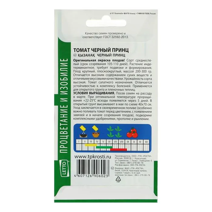 Семена «Томат Чёрный принц», 0,1 г — среднеспелый сорт (110–115 дней от всходов до плодоношения). Рекомендован для открытого грунта (с подвязкой к кольям), остеклённых и плёночных теплиц.