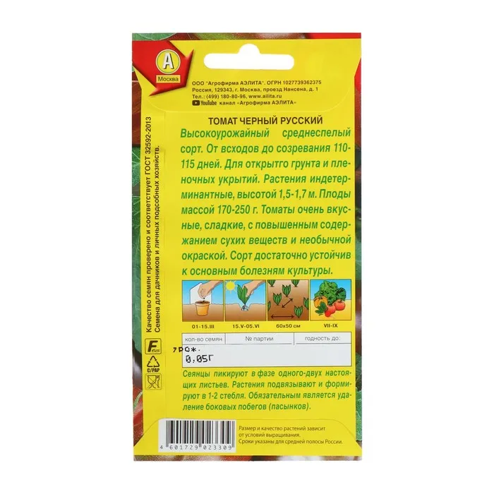 Посев на рассаду в марте. Пикировка в фазе 1-2-х настоящих листьев. Посадка рассады - в середине мая под пленку, в начале июня - в открытый грунт. Возраст рассады - 60-65 дней (в фазе пяти-семи настоящих листьев). Схема посадки 60х50 см.