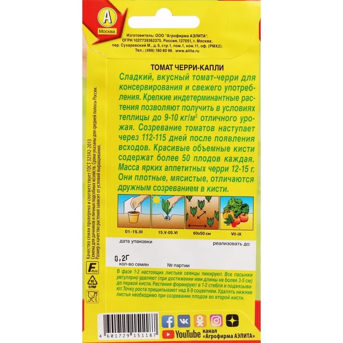 Сладкий, вкусный томат-черри для консервирования и свежего употребления. Крепкие индетерминантные растения позволяют получить в условиях теплицы до 9-10 кг/м2 отличного урожая. Созревание томатов наступает через 112-115 дней после появления всходов. Красивые объемные кисти содержат более 50 плодов каждая. Масса ярких аппетитных черри 12-15 г. Они плотные, мясистые, отличаются дружным созреванием в кисти.