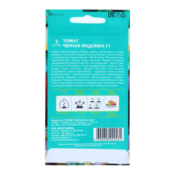 Новый черноплодный гибрид томата, великолепно созревающий в условиях средней полосы России. Раннеспелый, от всходов до плодоношения – 90-95 дней. Растение индетерминантное, листья темно-зеленые. Первое соцветие закладывается над 8-9 листом, последующие - через 3 листа. В кисти 5-6 плодов. Плоды выравненные, сладкие, красивые, очень плотные, массой 140-150 г, при полном созревании темно-коричневые, содержат много сухого вещества. Вкус – великолепный в результате гармоничного сочетания сахаров и кислоты. Использование – универсальное. Гибрид отличается высокой устойчивостью к комплексу болезней, высоким содержанием ликопина, плоды не растрескиваются даже при очень обильном поливе.