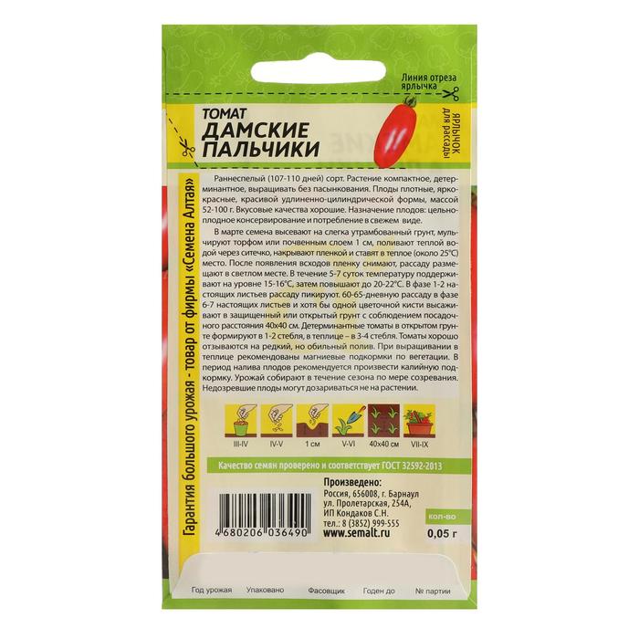 Раннеспелый (107-110 дней) сорт. Растение компактное, детерминантное, выращивать без пасынкования. Плоды плотные, ярко-красные, красивой удлиненно-цилиндрической формы, массой 52-100 г. Вкусовые качества хорошие. Назначение плодов: цельноплодное консервирование и потребление в свежем виде. В марте семена высевают на слегка утрамбованный грунт, мульчируют торфом или почвенным слоем 1 см, поливают теплой водой через ситечко, накрывают пленкой и ставят в теплое (около 25°С) место. После появления всходов пленку снимают, рассаду размещают в светлом месте. В течение 5-7 суток температуру поддерживают на уровне 15-16°С, затем повышают до 20-22°С. В фазе 1-2 настоящих листьев рассаду пикируют. 60-65-дневную рассаду в фазе 6-7 настоящих листьев и хотя бы одной цветочной кисти высаживают в защищенный или открытый грунт с соблюдением посадочного расстояния 40х40 см. Детерминантные томаты в открытом грунте формируют в 1-2 стебля, в теплице – в 3-4 стебля. Томаты хорошо отзываются на редкий, но обильный полив. При выращивании в теплице рекомендованы магниевые подкормки по вегетации. В период налива плодов рекомендуется произвести калийную подкормку. Урожай собирают в течение сезона по мере созревания. Недозревшие плоды могут дозариваться не на растении.